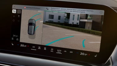 Cuatro cámaras en el vehículo escanean el entorno y representan obstáculos en la cercanía inmediata del vehículo. El conductor puede elegir entre diferentes vistas de cámara, lo que simplifica el aparcamiento y las maniobras. En la vista “Entorno”, obtiene una perspectiva de la situación general de aparcamiento en una vista cenital mostrada en el display del MMI, lo que puede ayudar a posicionar más precisamente el vehículo en el espacio de estacionamiento. Las vistas “frontal” y “trasera lateral” permiten mejor visibilidad cuando se sale de espacios estrechos de aparcamiento o de una entrada o salida de un garaje. La vista de cámara trasera y una visión similar hacia el frente complementan las opciones de presentación. El sistema se activa automáticamente al desplazarse el coche marcha atrás, o manualmente pulsando un botón en la consola central.